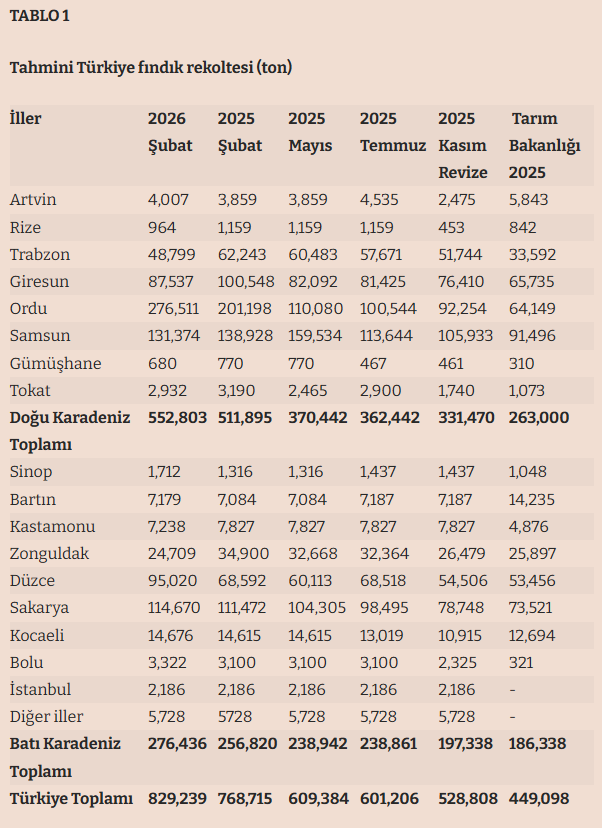 TABLO 2Türkiye’nin tahmini fındık rekoltesi (Ton)Bölge (Şubat 2026) (Şubat 2025) (Temmuz 2025) (Kasım 2025) (Revize 2025) (Tarım Bakanlığı)Doğu Karadeniz 552,803 511,895 362,345 331,470 263,000Batı Karadeniz 276,436 256,820 238,861 197,338 186,098Toplam 829,239 768,715 601,206 528,808 449,098 Kaynak: Ekonomi Gazetesi