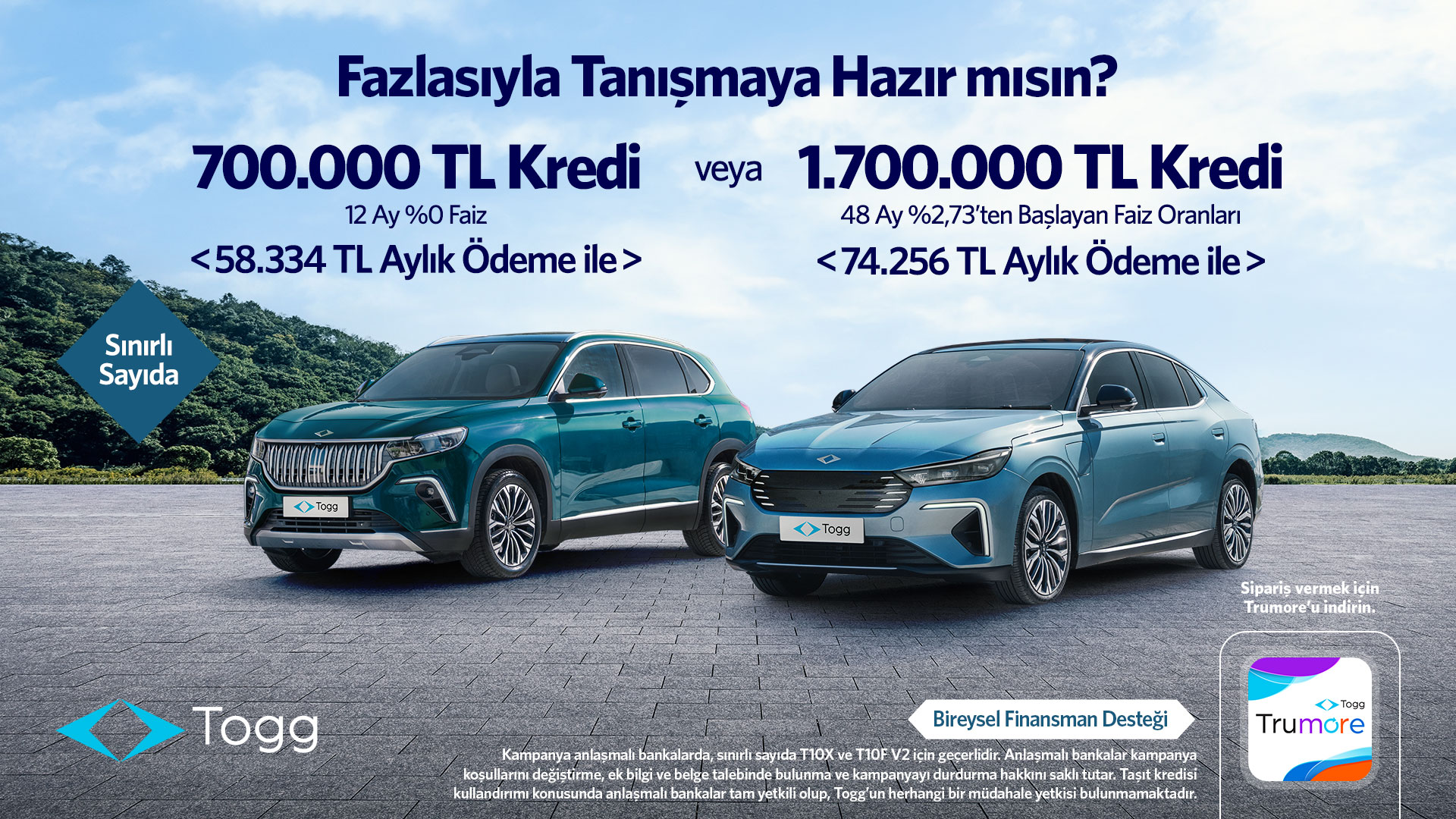 Rekor Faizsiz Kredi LimitiTOGG, bugüne kadar sunduğu en yüksek faizsiz kredi paketini devreye aldı. Daha önce T10X için 400 bin TL, T10F için 200 bin TL olan kredi limiti, ekim ayı itibarıyla her iki model için de 700 bin TL’ye yükseltildi. Böylece yerli otomobil almak isteyen tüketiciler için çok daha avantajlı bir finansman seçeneği sunulmuş oldu.